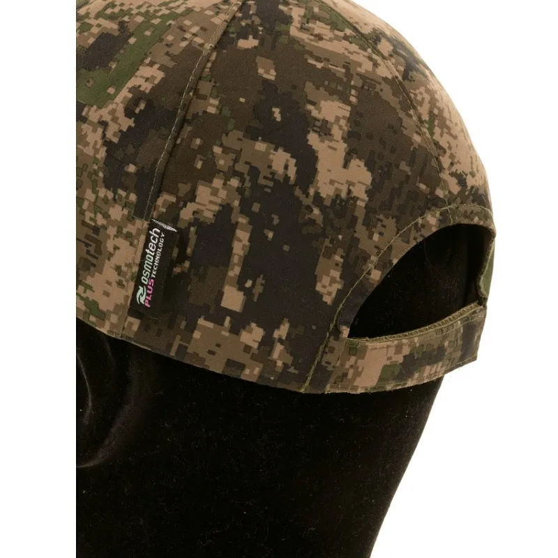 Nepremokavá a tichá maskáčová čiapka s ochranou proti prenasledovaniu. Zapínanie vzadu pre dobré padnutie.