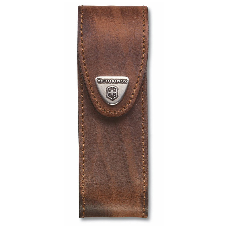 Hnedé kožené puzdro Victorinox vhodné na vreckové nože s veľkosťou 11,1 cm s 2 až 3 vrstvami. Zatvára sa na suchý zips a možno ho nosiť na opasku.