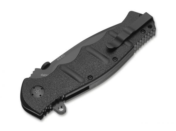 Veľká kombinovaná čepeľ s povrchovou čiernou úpravou z nerezovej ocele 440C vďaka plutve alebo palcovému gombíku sa dá jednoducho otvárať v jedenej ruke. Masívna ergonomická rukoväť je vyrobená z FRP- nylon vystužený sklenenými vláknami.
